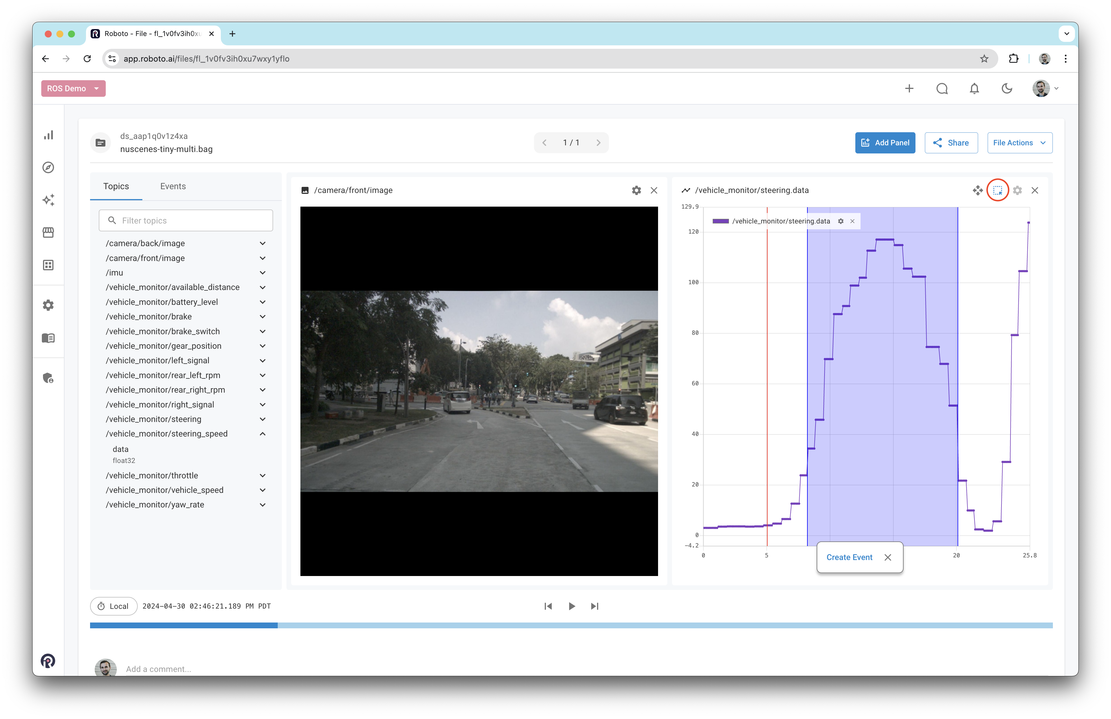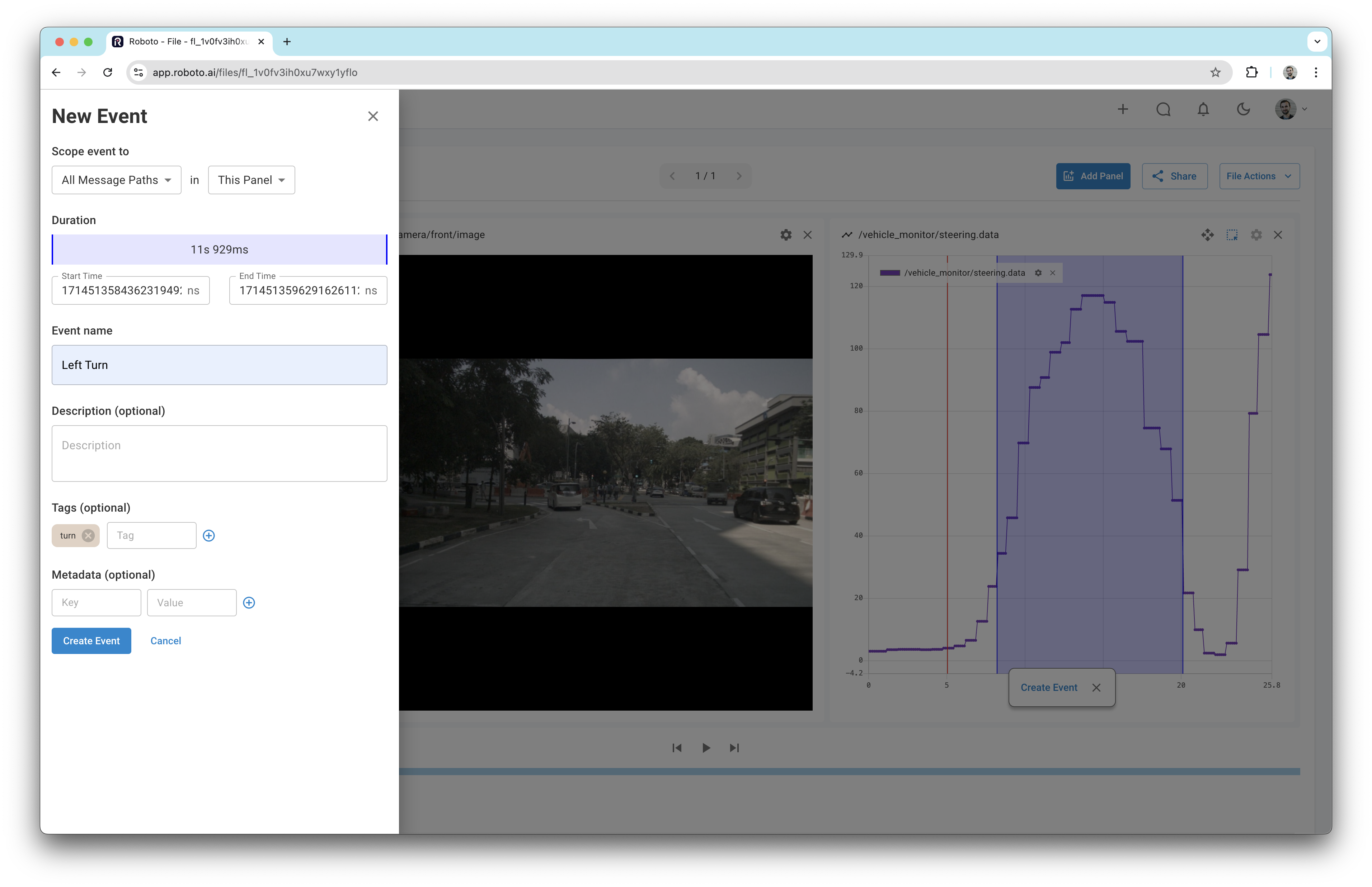 Roboto provides comprehensive support for creating events on your log data. An event enables you to link key entities, such as datasets, files, topics, and message paths, to a specific timespan.