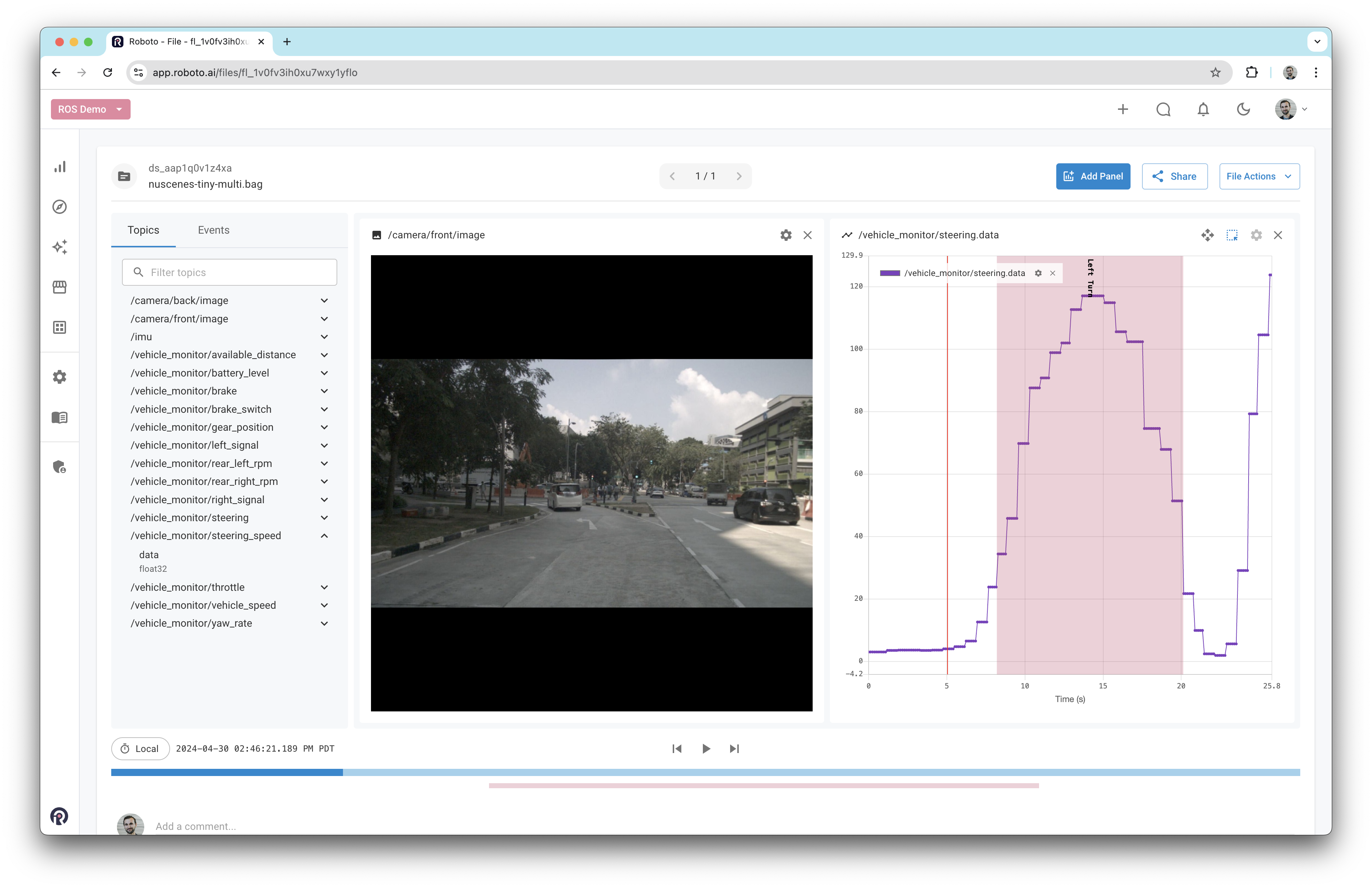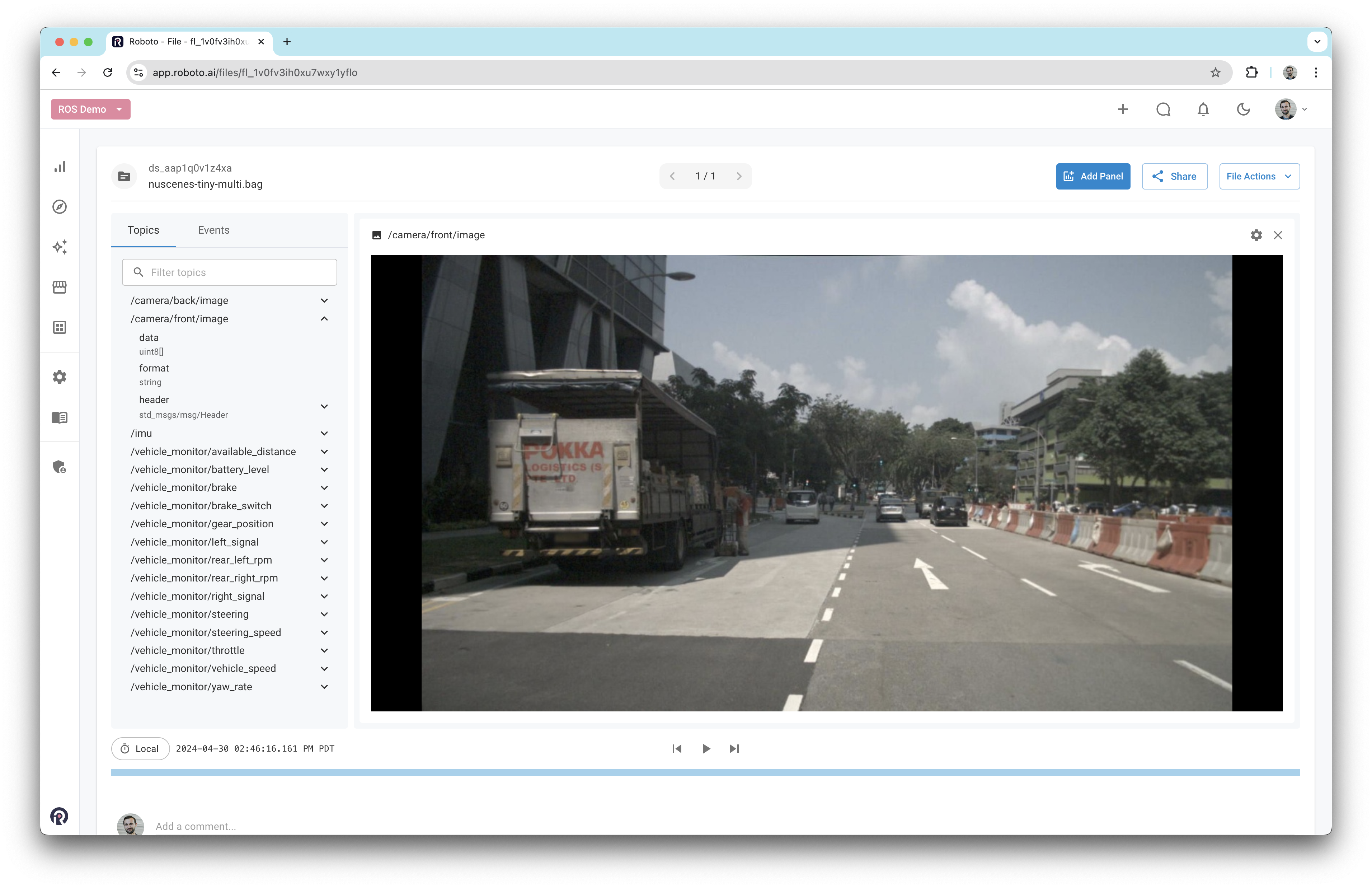 Once the log file has been ingested, you can double click on it to be taken to the visualizer. You can learn more about visualizing ROS data at Visualize Data.