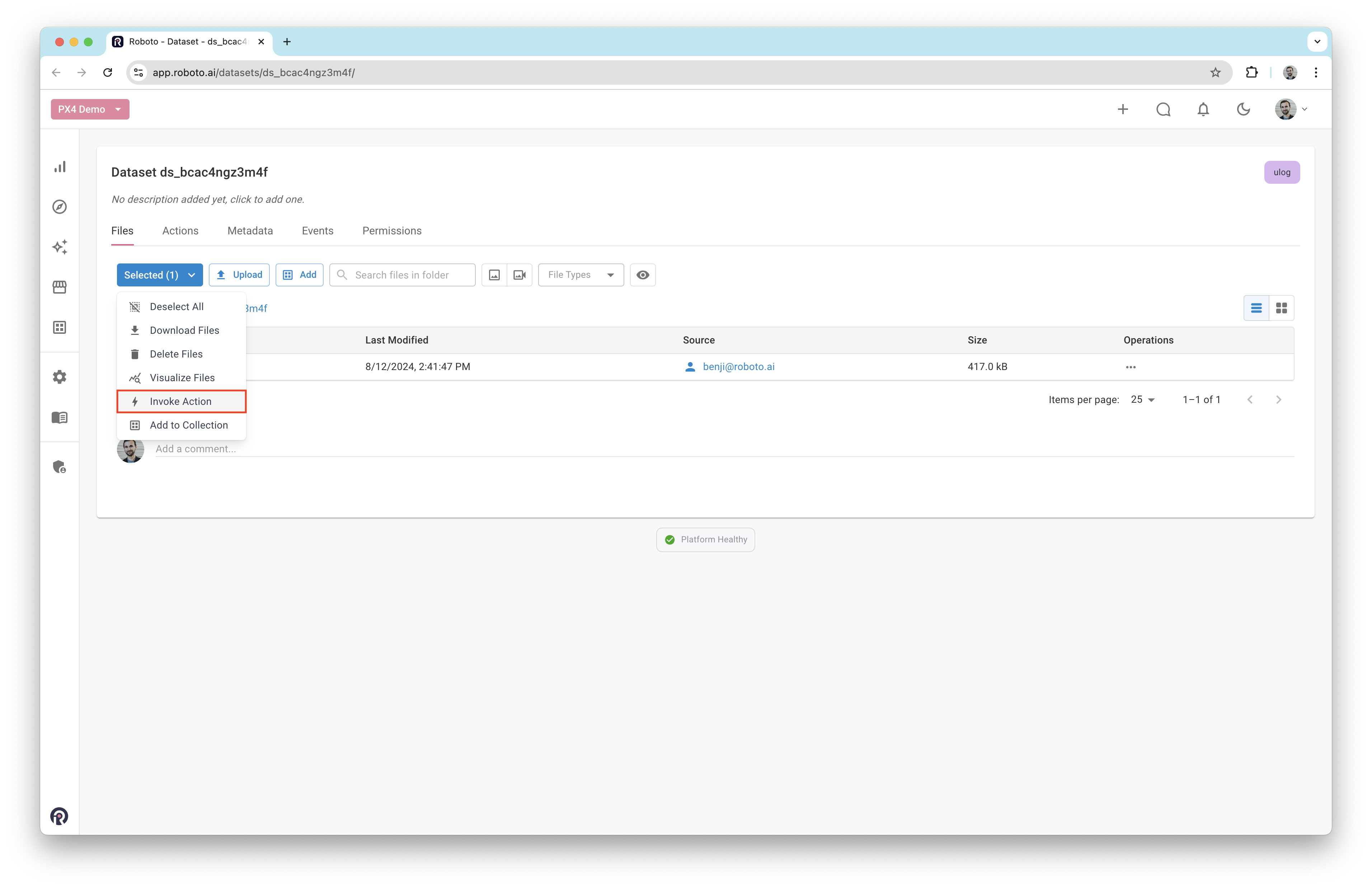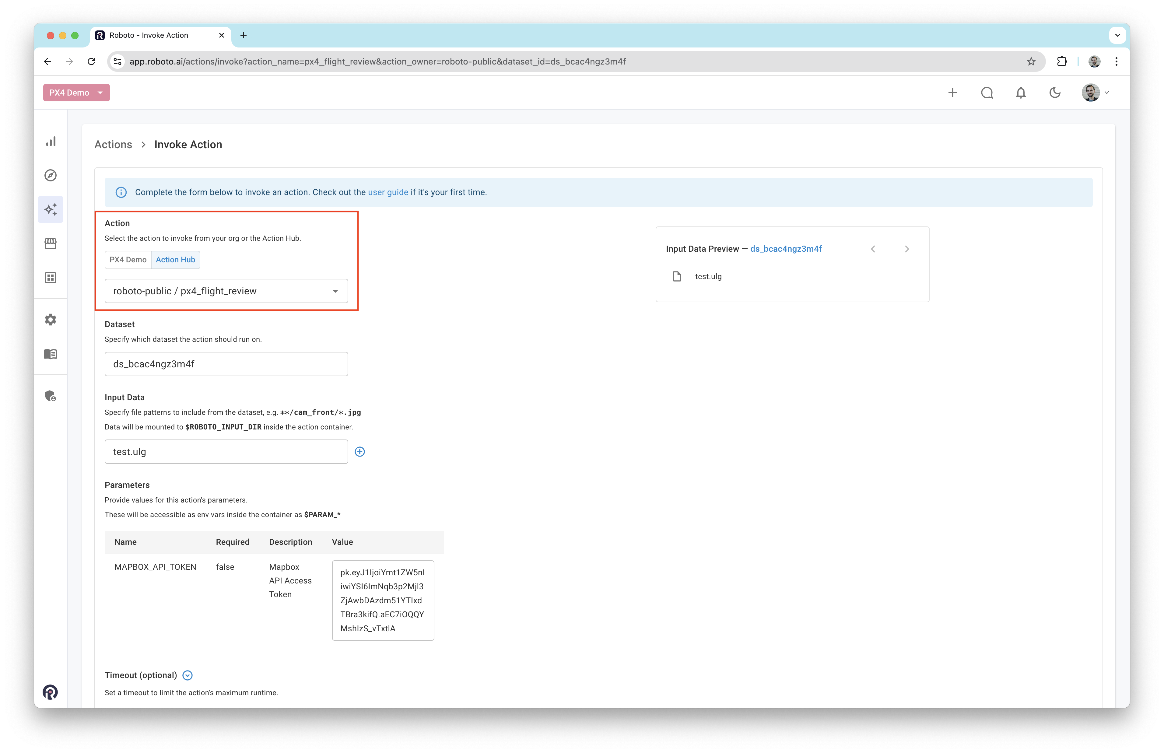roboto-public/px4_flight_reviewaction from the Action Hub tab. Click Invoke Action: