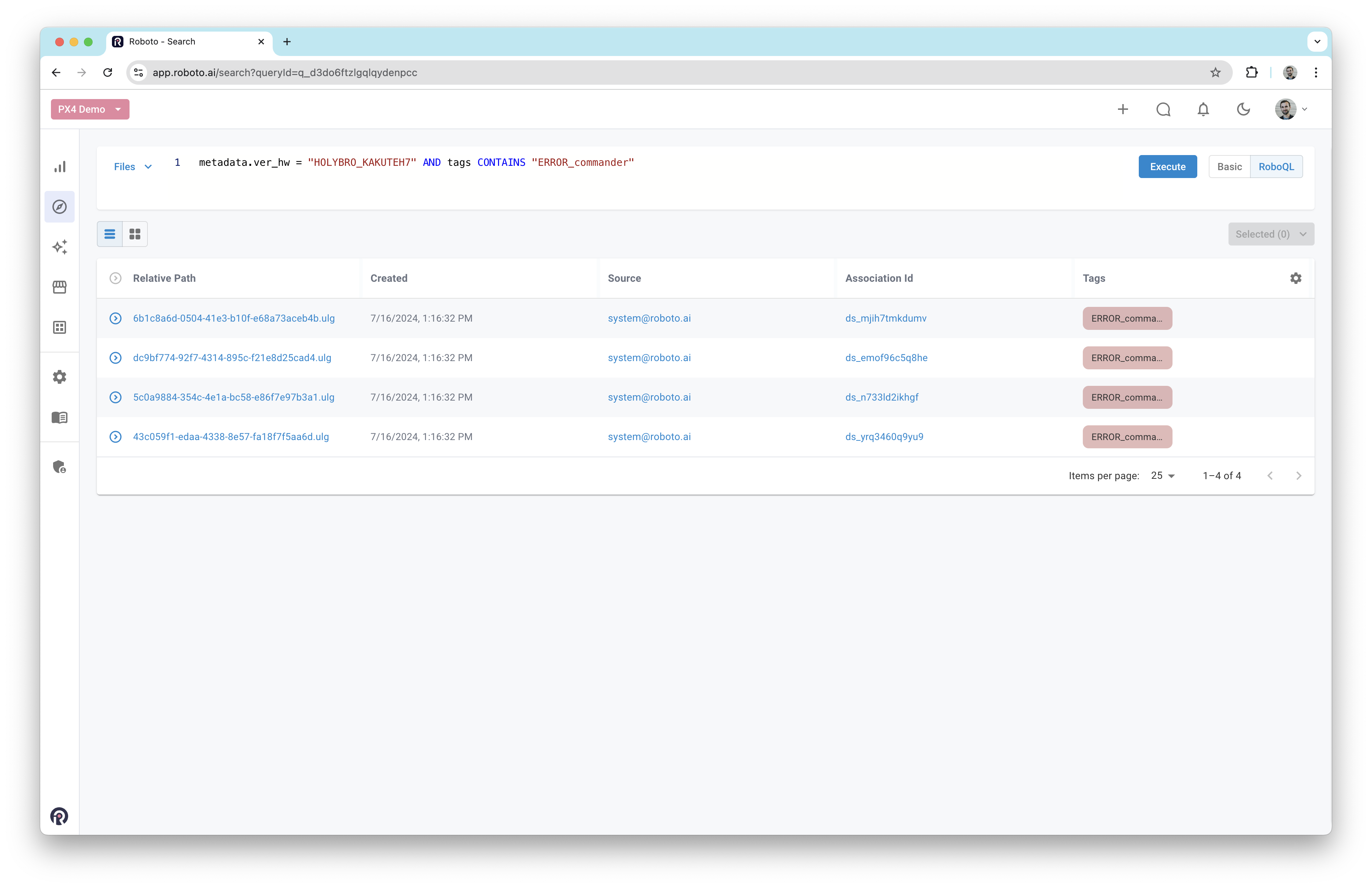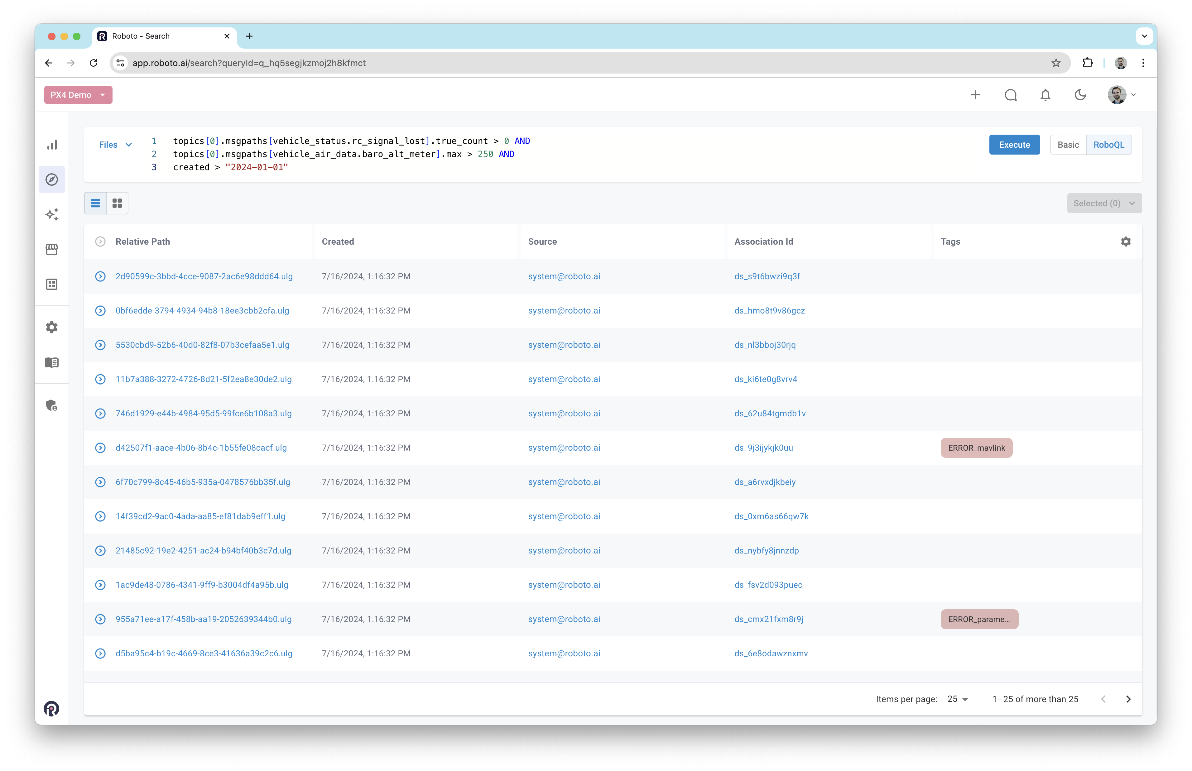 For the examples below, we uploaded about 1000 publicly available PX4 ULog files into an example Roboto account. The data includes logs from various vehicle types such as multirotors, fixed-wing aircraft, and VTOLs.