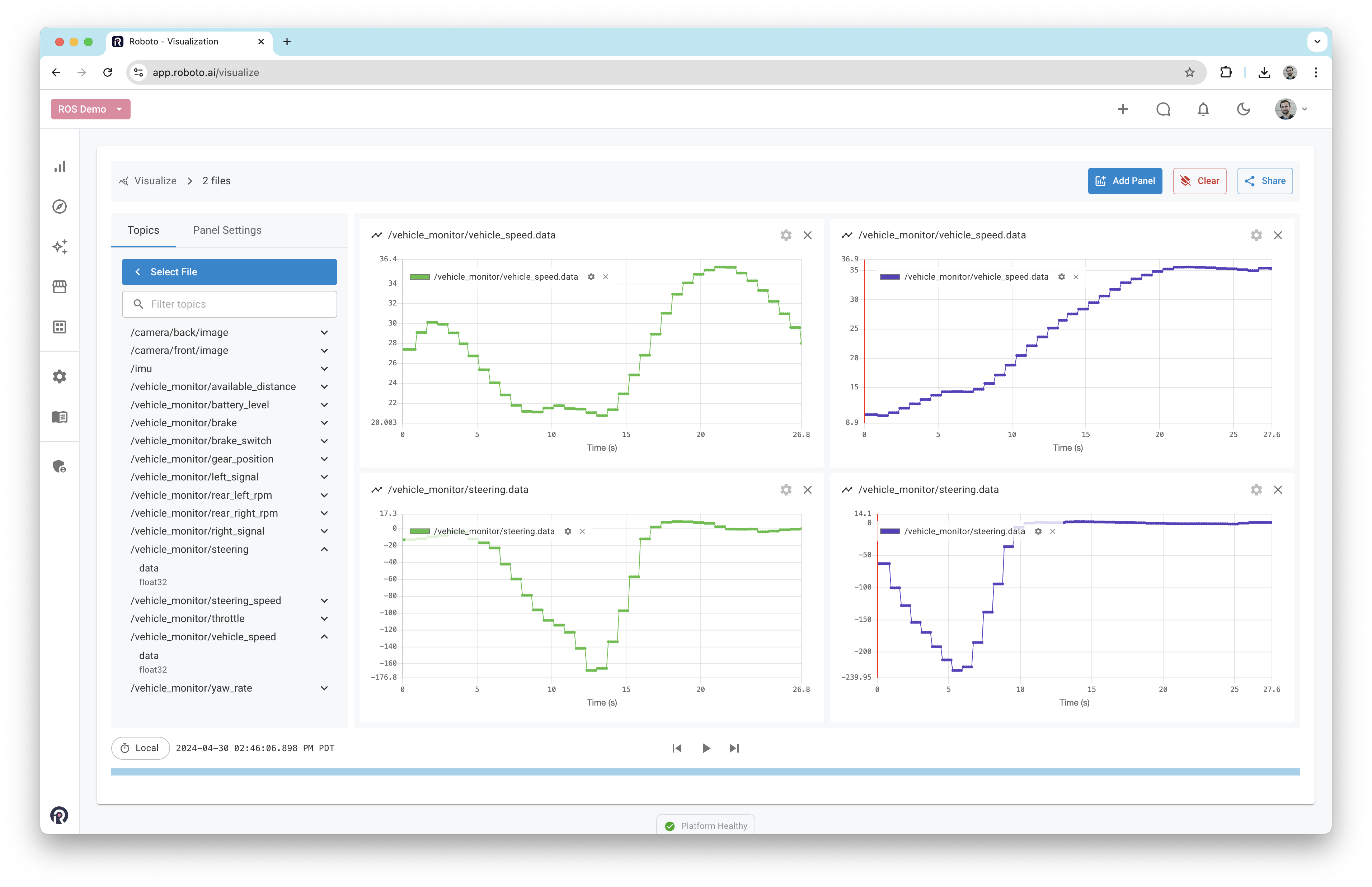 Roboto supports the following types of panels for ROS data: